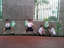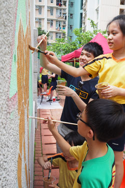 We outreach to teach, inspire, facilitate and work together with children to create community art works and support schools' visual art and creativity education. Having Morgan Stanley's staff-volunteer teams joined our mission, a creative and colourful long mural advocating environmental messages was produced within a day on 6th June 2015. And, on 18th June 2016, ten more creative pieces of site-responsive murals were born to bring more colours, beauty, imagination, energy, fun and surprise to the campus and Tin Shui Wai's community space! Children & volunteers were also motivated to invite local community members to interestingly interact with their joyful art works by playing photo-taking together, in engaging the community in another round of art-making and inducing their interest and concern towards the community space, art and children's school life! Post-events have also been continuously grown by the school - whole school's children tour around and play with the murals after exams, and continue our organized photo competition activity involving public voting!
